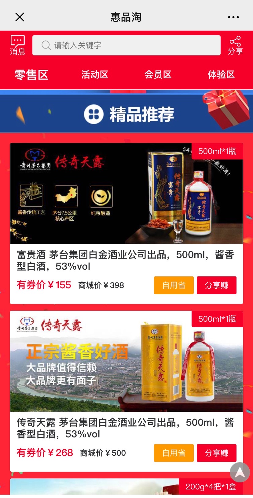 颜值君打开该商城看到,惠品淘平台将从前奇迹云商的主要产品茅台传奇天露酒作为主推产品,同样借贵州茅台集团的知名度来吸引消费者。