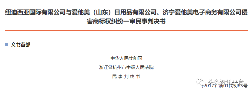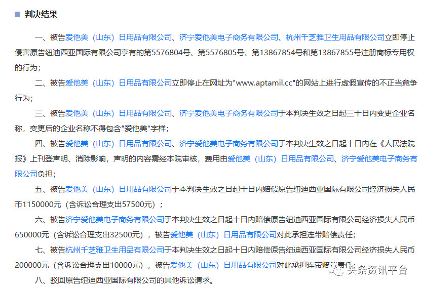 最终,杭州市中级人民法院判处被告爱他美(山东)日用品有限公司、济宁爱他美电子商务有限公司、杭州千芝雅卫生用品有限公司立即停止侵害原告纽迪西亚国际有限公司享有的第5576804号、第5576805号、第13867854号和第13867855号注册商标专用权的行为。被告杭州千芝雅卫生用品有限公司赔偿原告纽迪西亚国际有限公司经济损失20万元(含诉讼合理支出1万元),被告爱他美(山东)日用品有限公司对此承担连带赔偿责任。