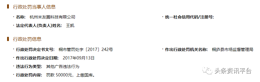 经查,杭州米友圈科技有限公司成立于2016年10月9日,法定代表人马向炜,股东有俞升(米友圈创始人、总裁)、王凯、马向炜、郑宾(大股东),注册资本1000万元,实缴100万元。其中,股东王凯还投资了另外一家苏州凯乐宝母婴用品有限公司,而这家公司在2018年9月28日因通过登记的住所或经营场所无法取得联系,被苏州工业园区市场监督管理局列入经营异常名录。值得一提的是,在2018年之前,米友圈公司的法定代表人一直是王凯,而就在王凯担任公司董事长和ceo的时期,米友圈因广告违法行为遭到了桐庐县市场监管局的行政处罚。