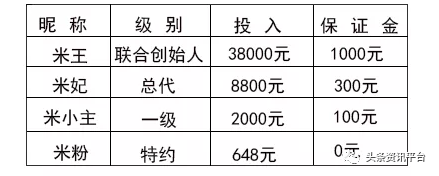 比如,要购买一包零售价为128元的米菲产品,米粉(投入648元,无保证金)需花费108元,即购买全部产品都享有8.4折;米小主(投入2000元,还需100元保证金)需花费98元,即购买全部产品都享有7.7折;米妃(投入8800元,还需300元保证金)需要花费88元,即购买全部产品都享有6.9折;米王(投入38000元,还需1000元保证金)需要花费78元,即购买全部产品都享有6.1折。