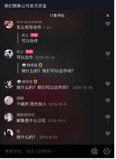 “财富”总是许多微商喜欢宣传的一种方式,也确实能吸引到相当多的人。在某短视频平台上,网信君发现一个小视频中码着一摞摞现金,是朝集公司颁发月奖金的情景。视频下许多用户纷纷留言询问“如何合作”。
