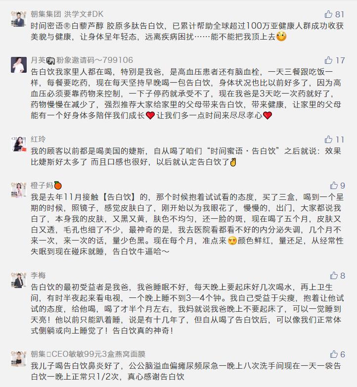 在朝集公司官方公众号的推文中,也不乏有称时间密语告白饮有“调节亚健康”、“调节高血压”、“调节月经不调”,“治好鼻炎、增生、囊肿”等评论被置顶。当问到时间密语系列产品是否为保健品时,朝集代理商称其为大健康口服轻奢食品。然而,作为普通食品却定位于大健康,宣称有保健品和药品的功效,难免让人心生疑惑。
