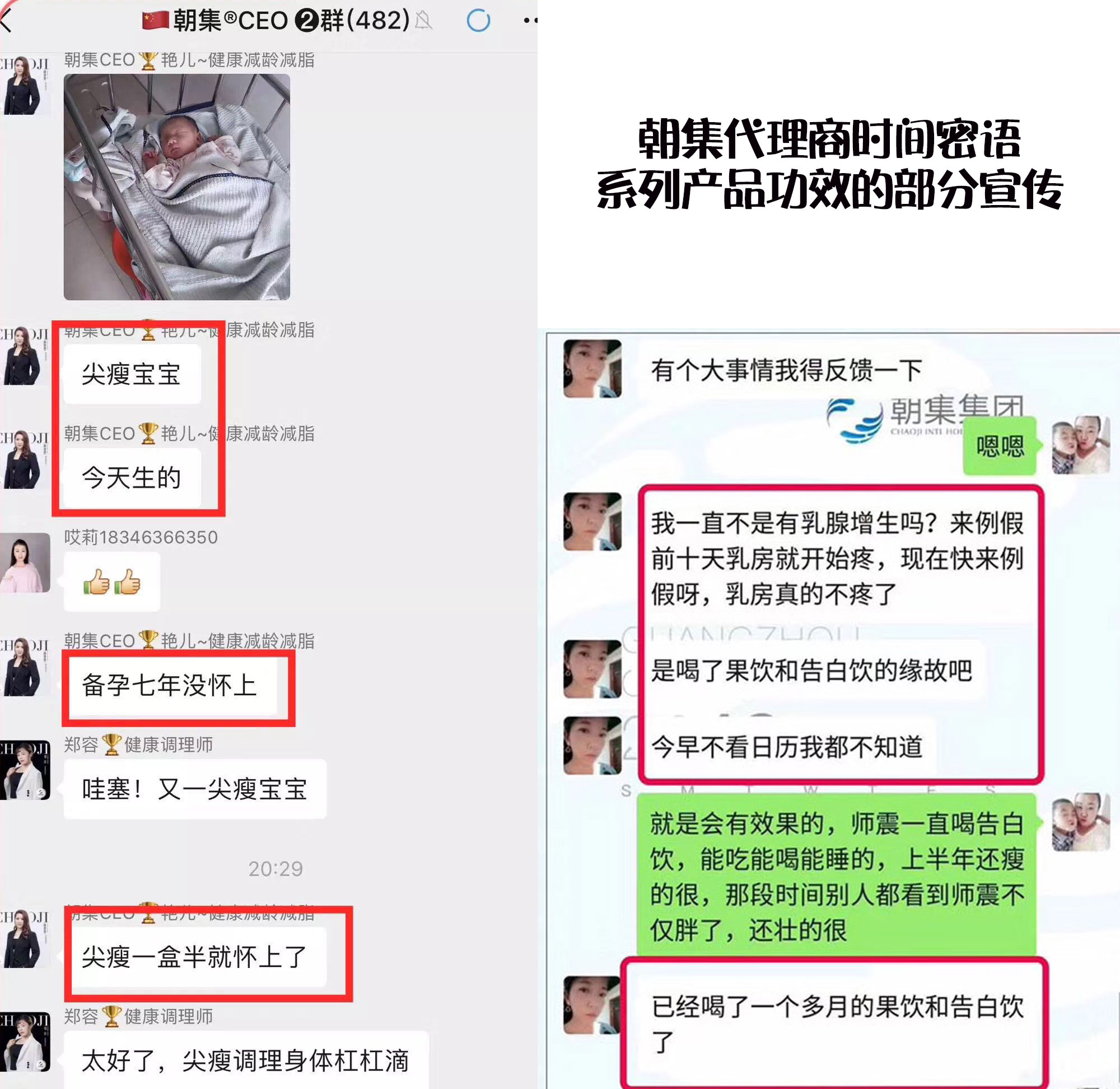 近日,网信君发现,由董璇、严屹宽代言,众多明星推荐的微商产品——朝集时间密语系列,被代理商称为美丽又健康的轻奢食品,甚至宣传有“调血糖、降三高、提高免疫力”等功效。同时,该系列产品的还有更吸引人的特点——“月入十万、百万不是梦”。