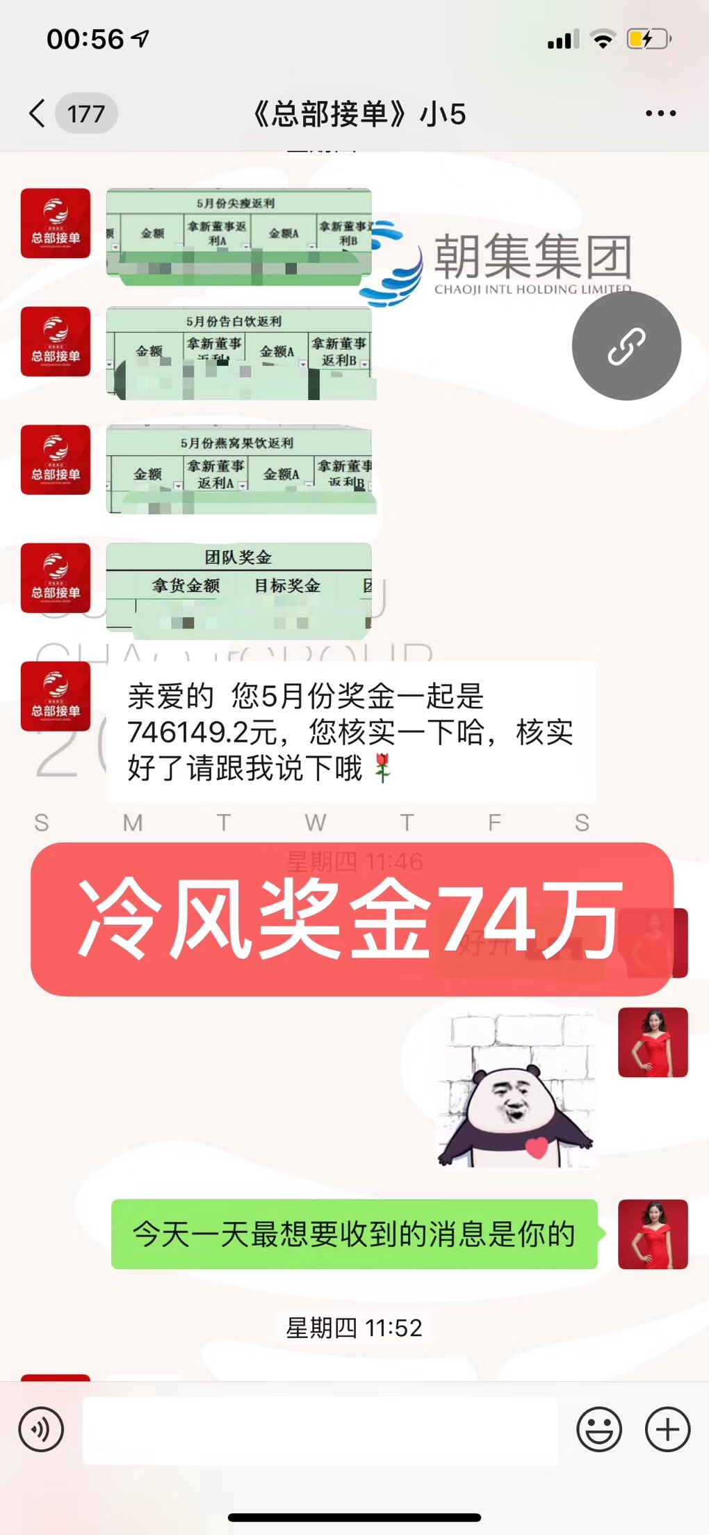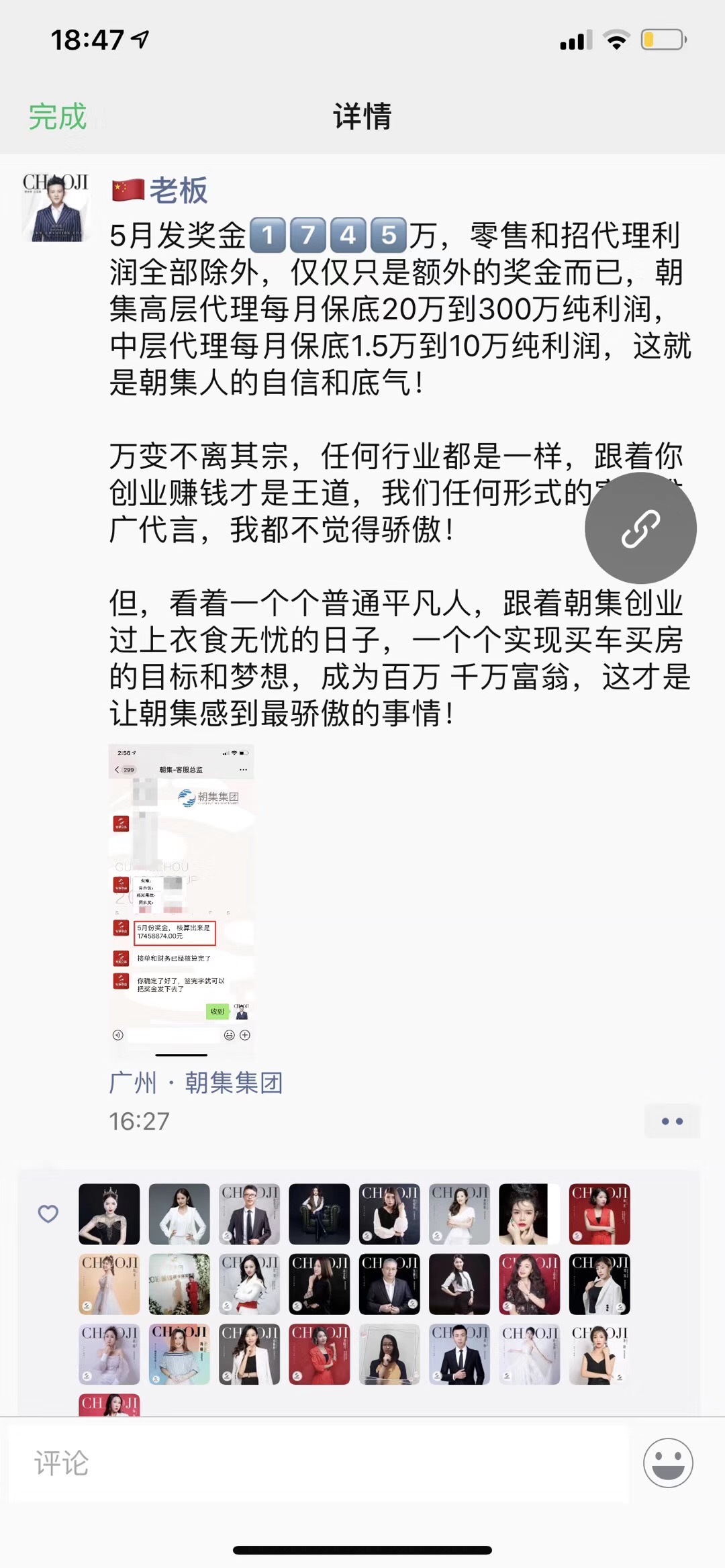 许多朝集代理商也喜欢在社交网络晒出月收入、分红奖励等,以此来吸引消费者和新代理加盟。