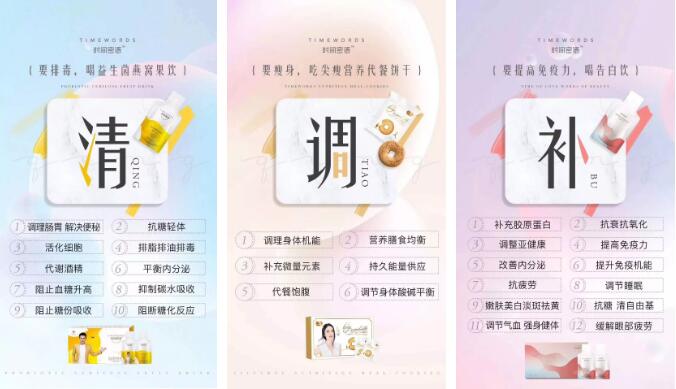 时间密语“清(益生菌燕窝果饮)、调(尖瘦饼干)、补(胶原多肽告白饮)”三部曲,也被称为“朝集三宝”。据朝集的代理商介绍,益生菌燕窝果饮具有调理肠胃、阻止血糖升高、代谢酒精、排油排毒等作用。