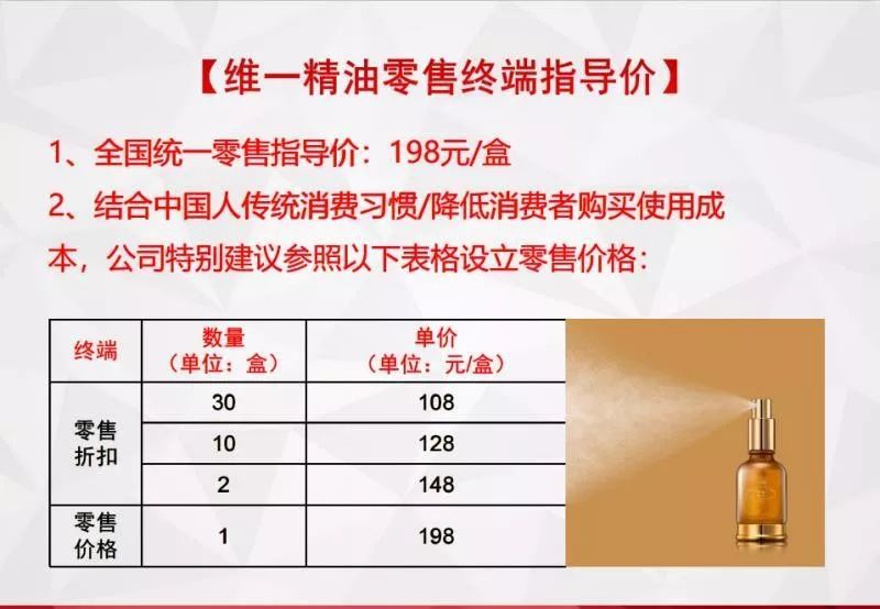 不同级别拿货的价格不一样,零售价格是1瓶198元;2瓶148元;10瓶128元;30瓶108元。一箱维一精油是30瓶,算下来拿货价是3240元。送福哥说,通常120瓶做代理称为经销商,公司会有授权书给到你们的。