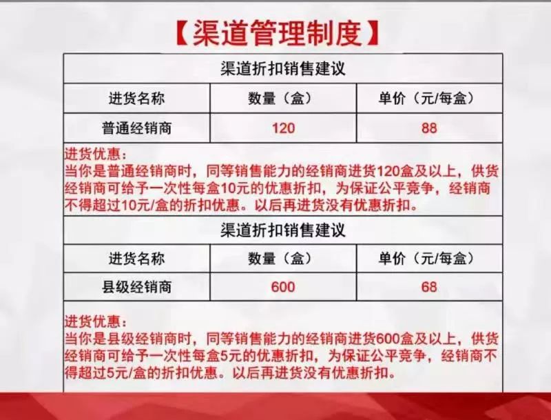 颜值君了解到,除此之外还有晋升资格分裂制度。你以为从120瓶经销商升级到600瓶经销商,只要给钱拿货就可以了?那你可就错了。送福哥在与颜值君交流时,发给颜值君多张制度表格,其中就有晋升机制。送福哥介绍,要想升级必须直推足够的人数,达到一定的销售数量才可以。其中直推后,该推荐人可给予每瓶10元的优惠折扣拿货。