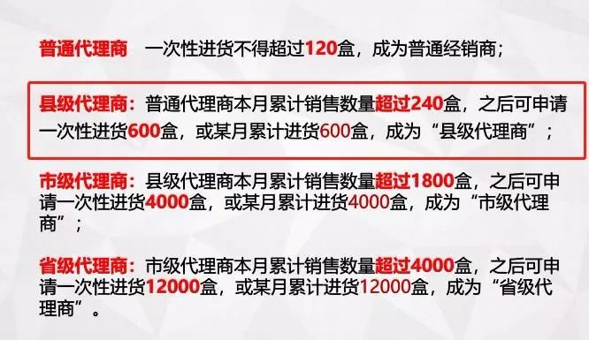 例如,如果想从120瓶经销商晋升为600瓶经销商,还需要直推两个120瓶经销商才可晋级,要想从600瓶经销商晋升为4000瓶经销商需直推3个600瓶经销商。