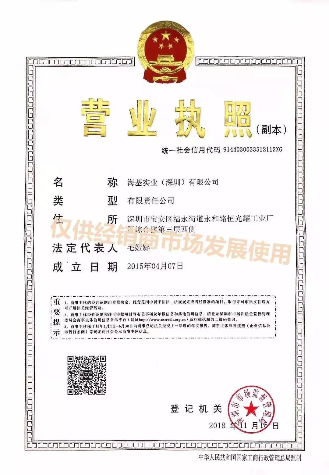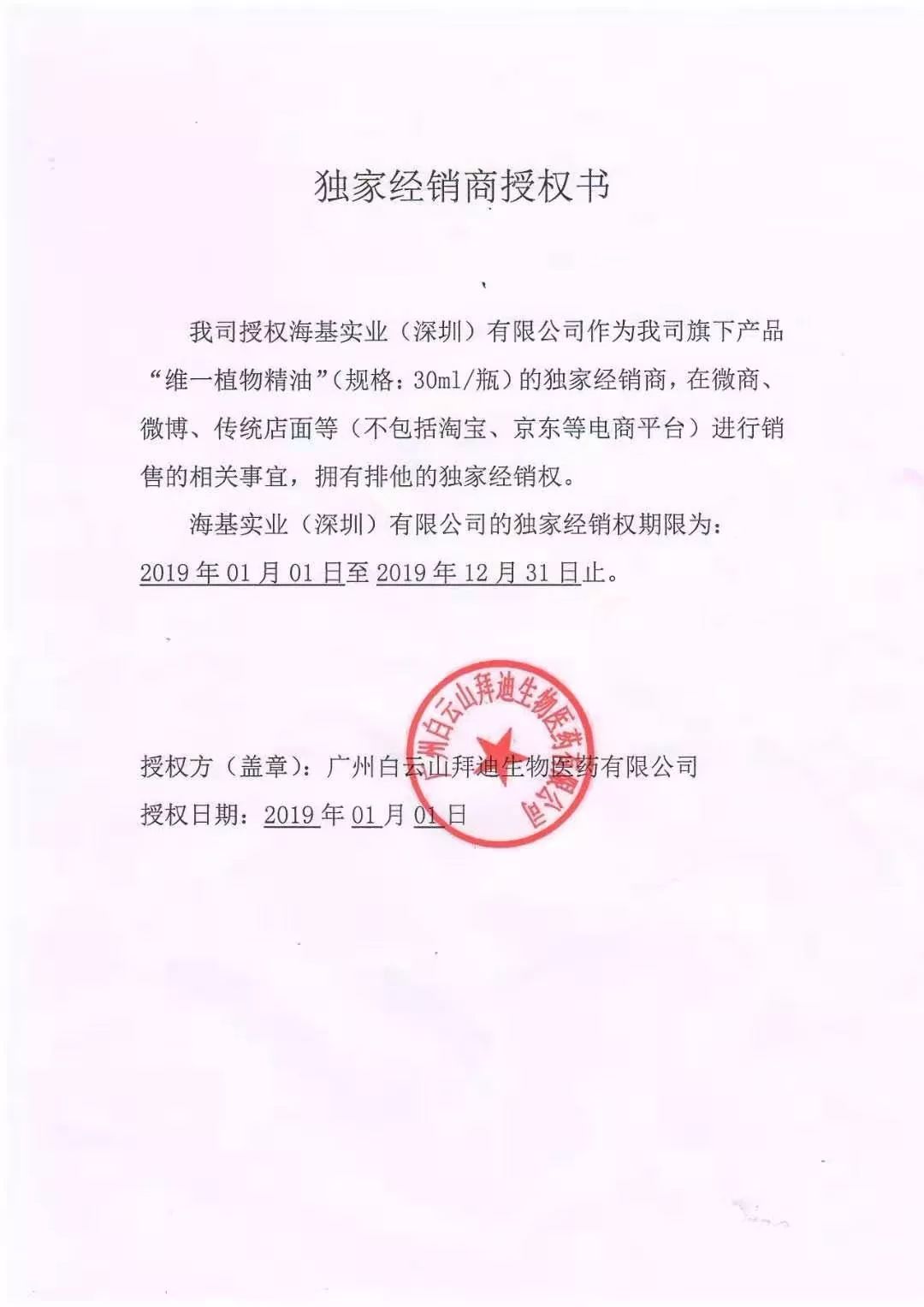据经销商提供资料显示,拜迪生物于2019年1月1日授权海基实业为维一精油的独家经销商,在微商、微博、传统店面等(不包括淘宝、京东等电商平台)进行销售的相关事宜,拥有排他的独家经销权,有效期限至12月31日截止。海基实业成立于2015年4月7日,法人朱如强,执行董事毛娅娜。注册资本3000万人民币,曾用名为海基贸易(深圳)有限公司、海基生物科技(深圳)有限公司。