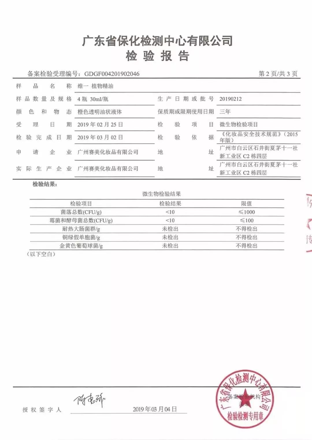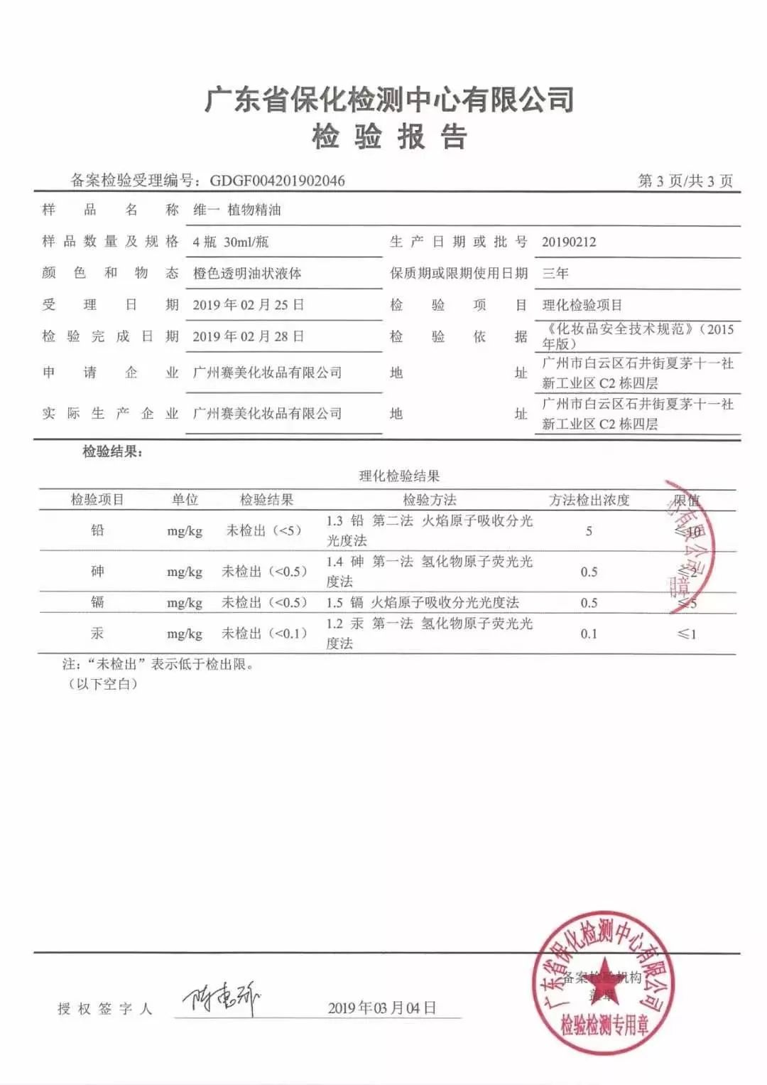 随后,送福哥发给颜值君多张关于维一精油的证明。其中包括海基实业营业执照,拜迪生物独家经销商授权书,拜迪生物营业执照,两家(赛美、九科精细)生产商的营业执照、广东省保化监测中心有限公司检验报告等。