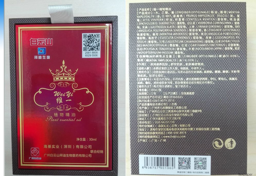 经销商介绍,白云山维一精油是由白云山拜迪生物医药(以下简称拜迪生物)研发的。品牌商为广药集团白云山(以下简称广药白云山),总经销商为白云山维一实业股份有限公司(以下简称维一实业),特约经销商为海基维一实业(福州)有限公司(以下简称海基维一)、海基实业(深圳)有限公司(以下简称海基实业),生产商为广州赛美化妆品有限公司(以下简称赛美)、广州市九科精细化工有限公司(以下简称九科精细)、宝爵生物科技(广州)有限公司(以下简称宝爵生物)。
