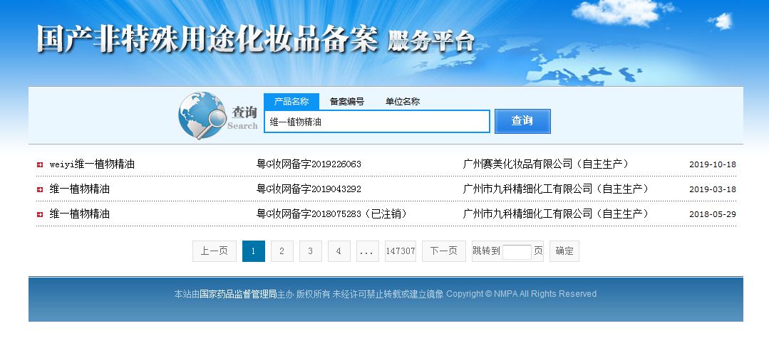 其后,颜值君在国家食品药品监督管理局官网上查询维一植物精油,共显示3条信息,其中一条为2019年2月24日所属九科精细的粤G妆网备字2018075283注销信息,但让颜值君疑惑的是并未有宝爵生物的身影。
