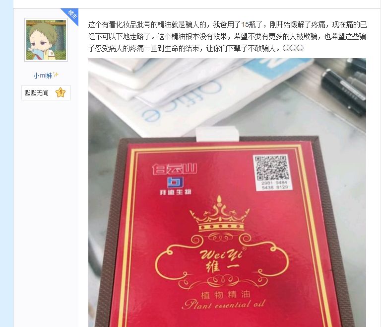一位名叫小mi妹的网友在贴吧中发帖:这个有着化妆品批号的精油就是骗人的,我爸用了15瓶了。刚开始缓解了疼痛,现在痛得已经不可以下地走路了。这个精油根本没有效果,希望不要有更多的人被欺骗。