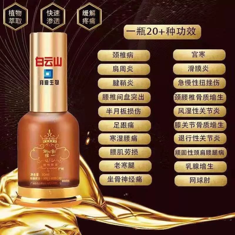 白云山维一植物精油是由白云山和海基集团联手推出,由广药白云山生产,由五十多种中草药浸泡提炼而成,成分有人参、藏红花、远志、木香、天麻等。结合现代高科技精纯提取技术及药物纳米渗透科技,可治20种疾病。以上是代理商对外宣称维一植物精油(以下简称维一精油)的部分好处。