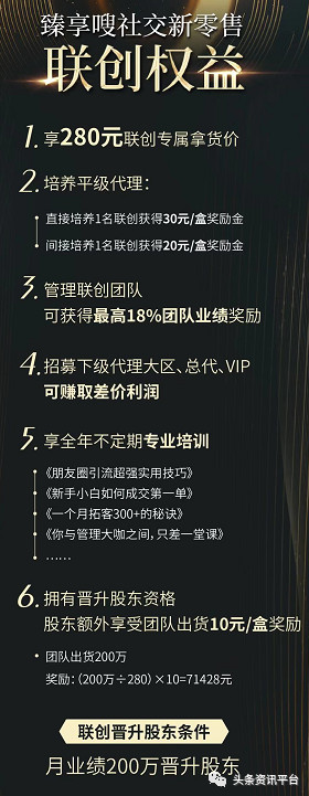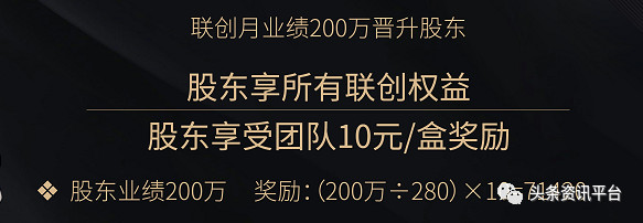 当联创月业绩达到200万元时,将晋升为股东,股东不但将享有所有联创权益,还将享受团队10元/盒的奖励,而若以200万元的股东业绩推算,其将得到的奖励金额为71420元。