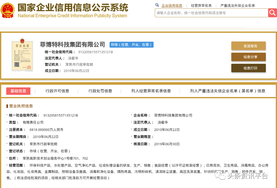 据相关资料显示,“菲博特”全名为菲博特科技集团有限公司,原名苏州菲博特环保科技有限公司,成立于2010年6月,法定代表人为汤爱华,注册资本8818万人民币,实缴资本8818万人民币,总部坐落在苏州·常熟经济开发区。该集团的经营范围有环保科技产品、空气净化产品、垃圾处理设备的研发、生产、销售;食品经营(以许可证核准经营);日用百货、卫生用品、消毒用品、办公用品、化妆品等方面。