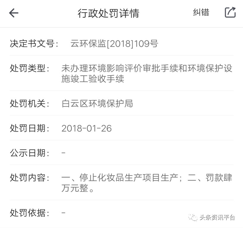 经查,菲博特旗下的广州真润生物科技有限公司在2018年1月份还因未办理环境影响评价审批手续和环境保护设施竣工验收手续被广州白云区环保局处罚,不仅要求被停止化妆品生产项目生产 ,还被罚款四万元整。