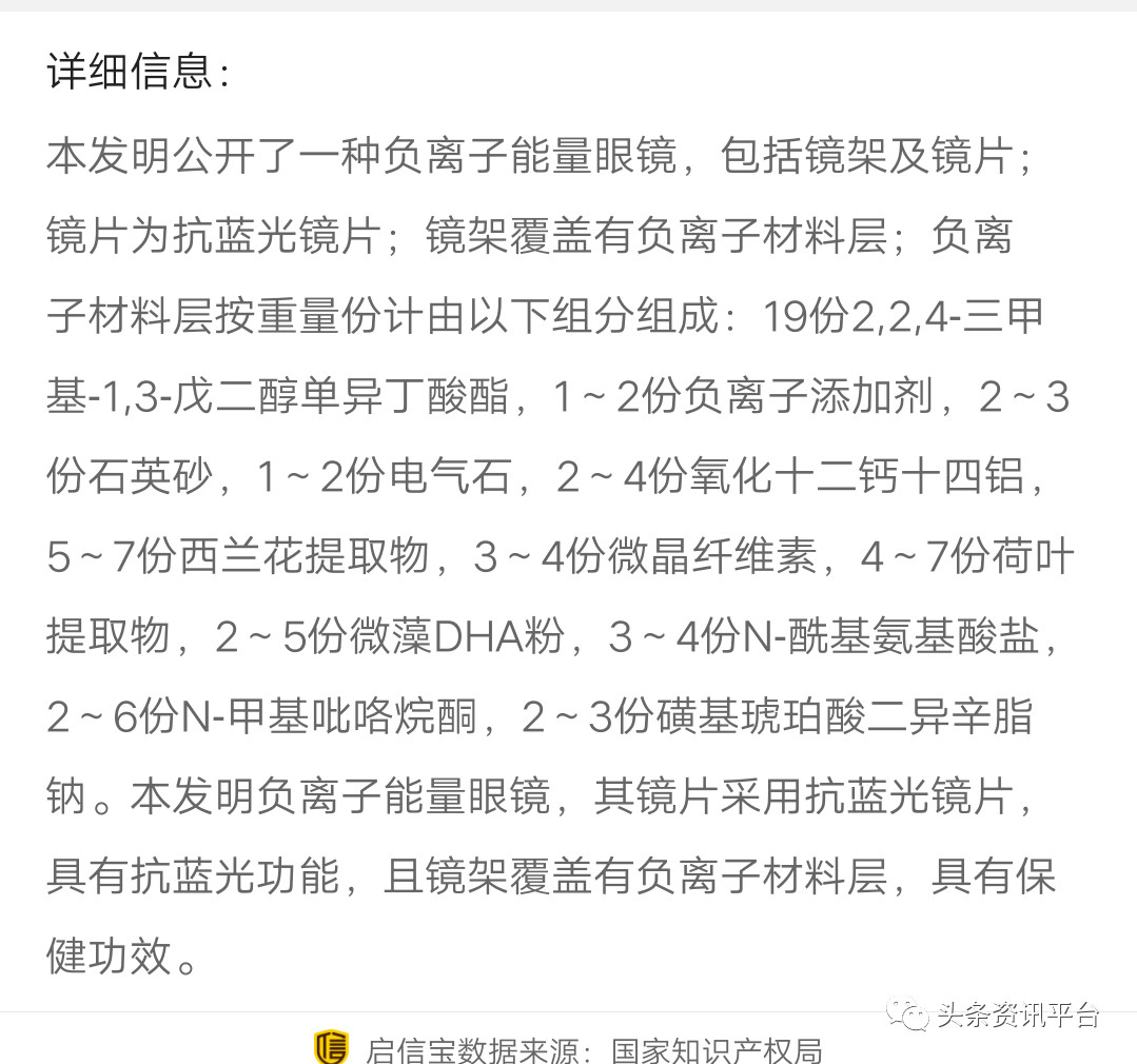 我们还在相关专利平台上发现了这款眼镜的专利信息,它在详细介绍中并没有提到可以治疗多种眼病,而只提到其镜片采用抗蓝光镜片,具有抗蓝光功能,且镜架覆盖有负离子材料层,具有保健功效。由此看来,这难道不是夸大了他们的产品功效吗?
