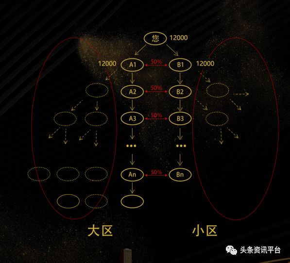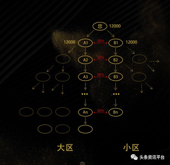 举个例子来看,就是假设在你的左区第一层有了第一个会员A1(12000),你的右区也有了一个会员B1(12000),则你获得50%的层碰奖,也就是6000元;同样,当你第二层左区有了会员A2,第二层右区有一个会员B2,则又可获得第二层层碰会员报单金额50%的层碰奖,如此下去,第四层、第五层,直到无限层分别都可获得50%的层碰奖。