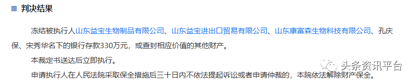 另据时间标注为今年8月的《交通银行股份有限公司济宁分行、山东益宝生物制品有限公司执行实施类执行裁定书》显示,山东省济宁市任城区人民法院支持交通银行股份有限公司济宁分行的执行申请,冻结被执行人山东益宝生物制品有限公司、山东益宝进出口贸易有限公司、山东康富森生物科技有限公司、孔庆保、宋秀华名下的银行存款330万元,或查封相应价值的其他财产。