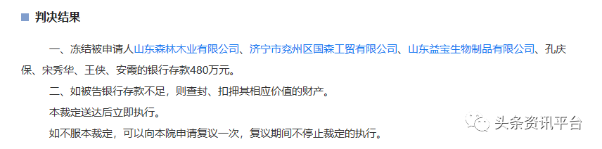 历史总是惊人的相似,在此三年前的2016年,山东省济宁市任城区人民法院应济宁银行股份有限公司申请,判决冻结被申请人山东森林木业有限公司、济宁市兖州区国森工贸有限公司、山东益宝生物制品有限公司、孔庆保、宋秀华、王侠、安霞的银行存款480万元。