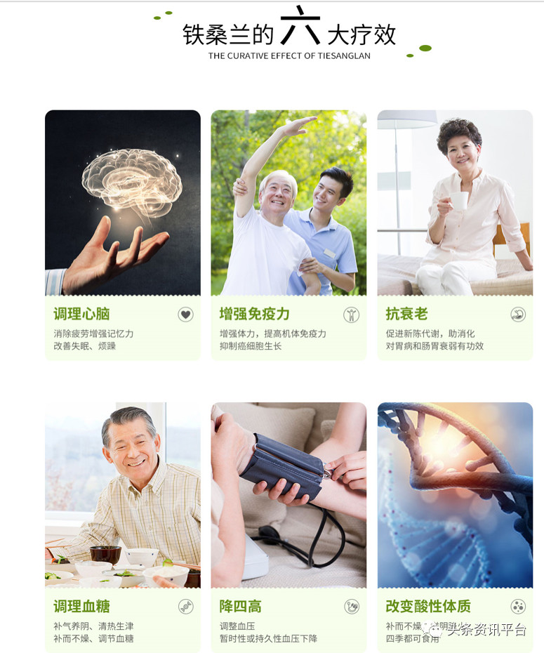 据微信公众号“铁桑兰茶叶”介绍,铁桑兰是种高碱性草本植物,富含人体所需的上百种微量元素,是“血液的清道夫,排肠毒的保洁员,三高症的克星,心脑血管病人的福音”。
