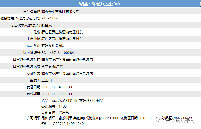 尽管在各种平台网站中宣传得看似包治百病,但其实铁桑兰茶只不过是一款普通食品,甚至连保健食品都不是。经查,临沂铁桑兰茶叶有限公司的生产许可证编号为SC11437131100284,食品类别为茶叶及相关制品类别,代用茶品种明细为含茶制品(其他类)中的袋泡茶。