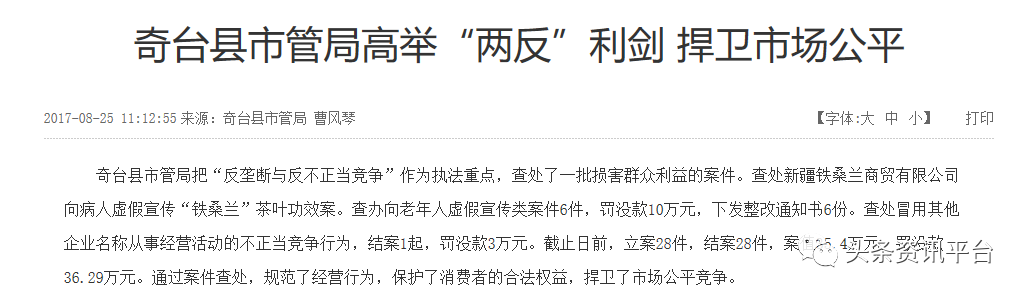 据奇台县人民政府官网披露,早在2017年,当地相关部门就曾查处了一起新疆铁桑兰商贸有限公司向病人虚假宣传“铁桑兰”茶叶功效案。如今,新疆铁桑兰商贸有限公司已经注销。