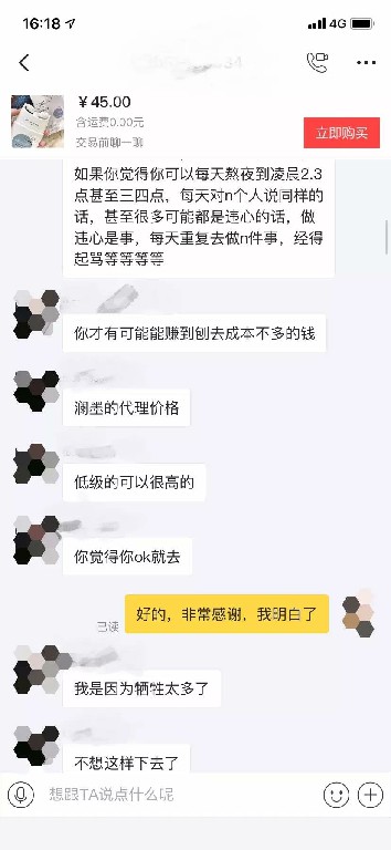 随后颜值君联系上了小婷。“我实话跟你说吧,如果你觉得你可以每天熬夜到凌晨两三点,可以每天对多人说同样的话,甚至很多可能都是违心的话,做违心事,每天重复去做很多事,经得起骂等等,你才有可能赚到除去成本后不多的钱。”