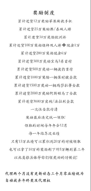 “累计进货12万元奖励苹果最新款手机,累计进货200万奖励现金6万元,累计进货1000万奖励一辆保时捷全款,累计进货2000万奖励阿斯顿马丁全款。”澜墨奖励制度上写到。