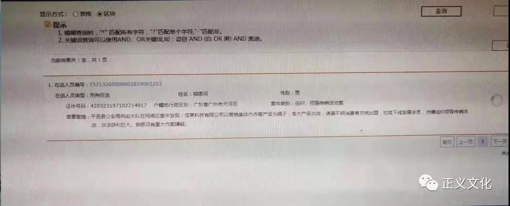 新零售经济网查询发现,微信公众号“正义文化”在9月12日也曾发布过熊银河被通缉的消息,其中一张截图显示“平邑县公安局网安大队在网络巡查中发现:佳莱科技有限公司以营销美体内衣等产品为幌子,夸大产品功效,诱骗不明消费者交钱加盟,拉拢下线发展会员,涉嫌组织领导传销活动,非法获利巨大。熊银河有重大作案嫌疑。”
