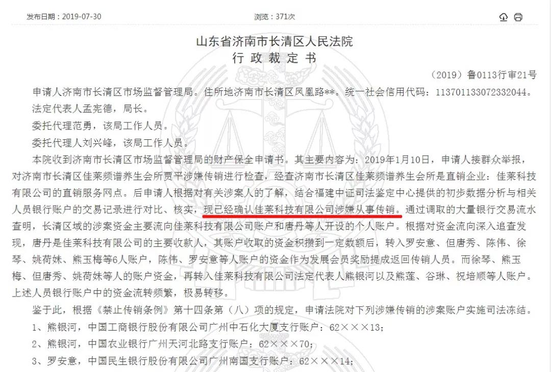7月30日,中国裁判文书网公示了一则行政裁定书,佳莱因涉嫌从事传销被山东省济南市长清区市场监管局申请冻结11个相关银行账户,但长清区人民法院以“该项所指的司法机关主体并不明确”等理由未予受理。