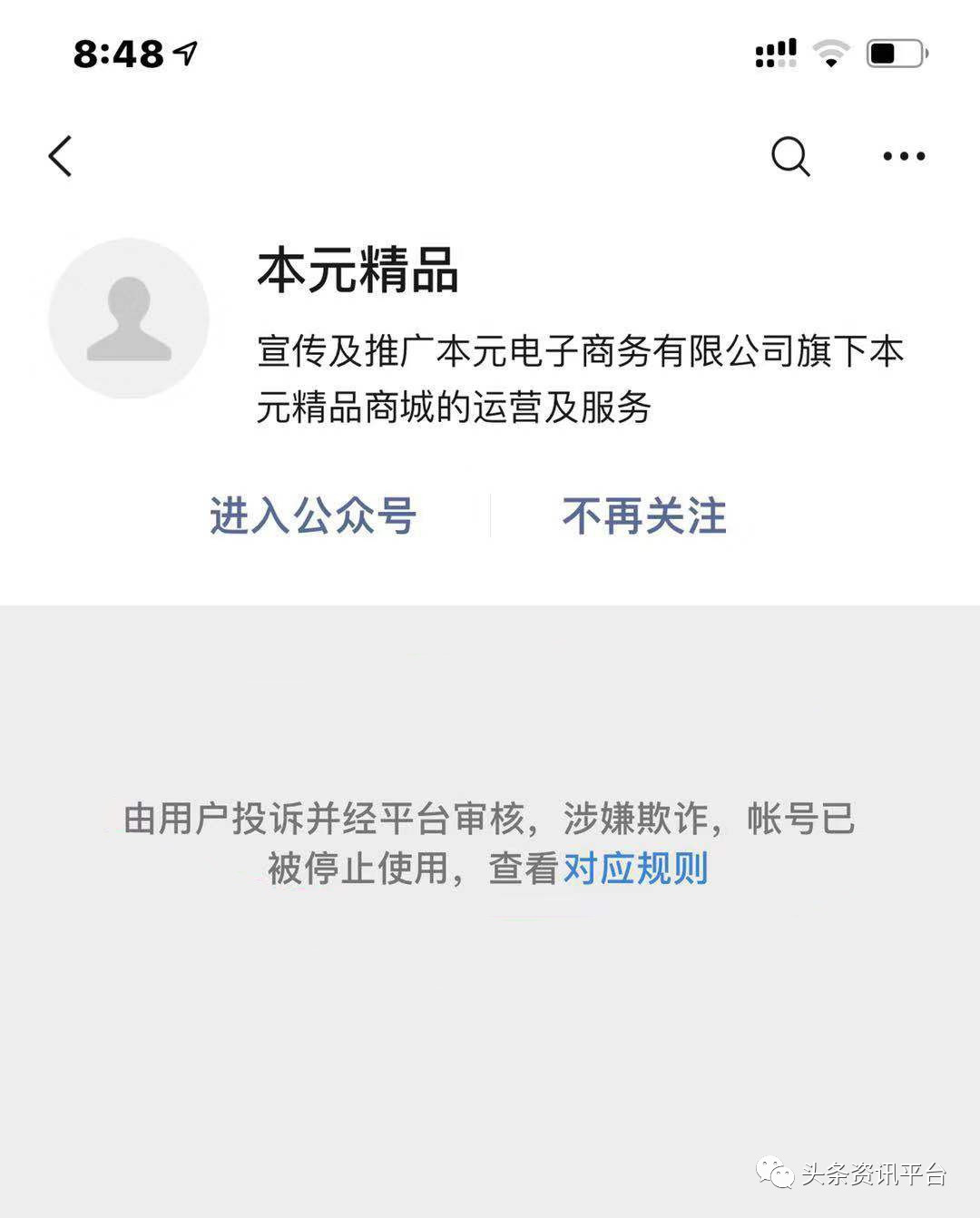 广东本元电子商务有限公司投资了这么多的公司,看似背景雄厚、资产庞大,但现如今,本元精品商城的官方微信公众号“本元精品”却已因违规无法关注,原因为“由用户投诉并经平台审核,涉嫌欺诈,账号已被停止使用。”