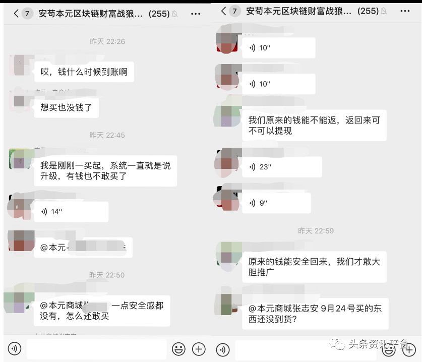 本元精品商城在运行一段时间后就出现了各种各样的问题。今年七月底该商城称其需要重启,重启就是指冻结消费者的资金,不给消费者返现了,需要去新的平台消费才能激活之前的金额。到八月份后,该商城又需要重启,还是没有给消费者返现。九月份和十月份也依然如此,页面显示提现失败。这一系列的运营过程引起了消费者的不满,大家纷纷开始维权,本元精品也开始暴露在各个社交软件上。一位熊先生在网站上投诉他在本元精品商城投入了5000元,但是在他购买商品十几天之后既没有收到货品也没有返现钱。下图为提现失败截图和维权群受害者截图:
