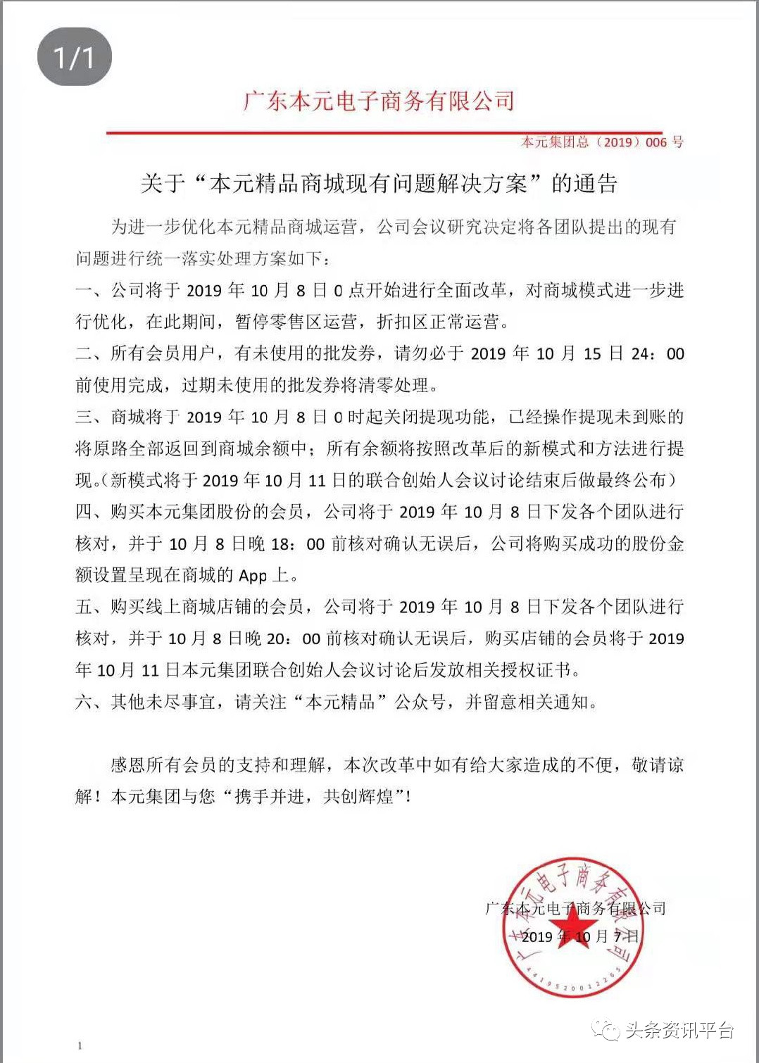 面对消费者的质疑以及各个社交软件的曝光,广东本元电子商务有限公司发出了有关本元精品商城现有问题的解决方案的公告。公告中提到了关于批发券、提现功能、资产余额的解决方案。