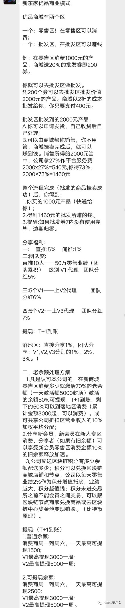 优品商城分为零售区和批发区,操作方式和购买流程与本元精品大致相似。2.收益来源是直推、间推和团队奖。3.老余额处理方案:消费多少就激活70%的老余额;分享新会员释放10%的老余额;配送同等数额的区块链积分。4.级别不同,提现金额不同。