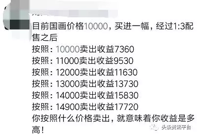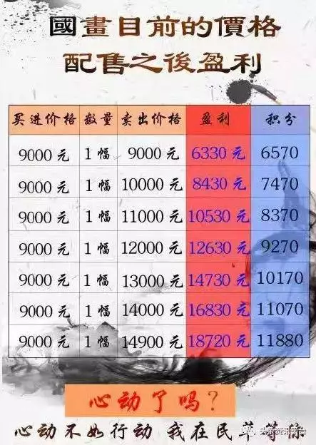 至于收益到底有多少,据另一位推广人员孟某介绍,以2500元/幅的价格买进10幅的话一共是25000元(这是10幅需要的资金),下一期发行按照1:3的比例给你配售30副,按照299元/幅计算,总共33970元(做十幅总投资),然后交割(就是提货,平台会将这10幅画免费邮寄到大家手中)。