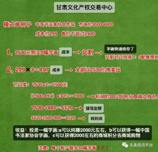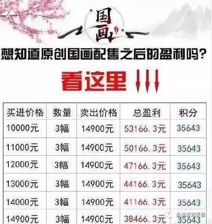 张某还透露称,具体的模式指的是买进1幅(邮寄到手中1幅实物字画)批发价格赠送3幅;买进2幅(邮寄到手中2幅实物)批发价格赠送6幅;买进3幅(邮寄到手中3幅实物)批发价格赠送9幅……以此类推,买进10幅(邮寄到手中10幅实物)批发价格赠送30幅(最大交割量是10幅配送是30幅),批发价为299元。