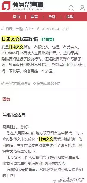 而在领导留言板上,也有网友称其被甘肃文交民粹中心所骗,在今年8月末,兰州市公安局回应称:“市公安局工作人员致电您了解详细情况后告知,此情况请您自行到辖区派出所报案处理。”