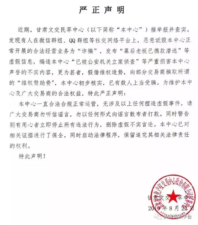 对于上述有关“甘肃文交骗局”等消息与传闻,甘肃文交民粹中心则曾多次发布声明进行反驳,并称平台将保留依法追究侵权者法律责任的权利。