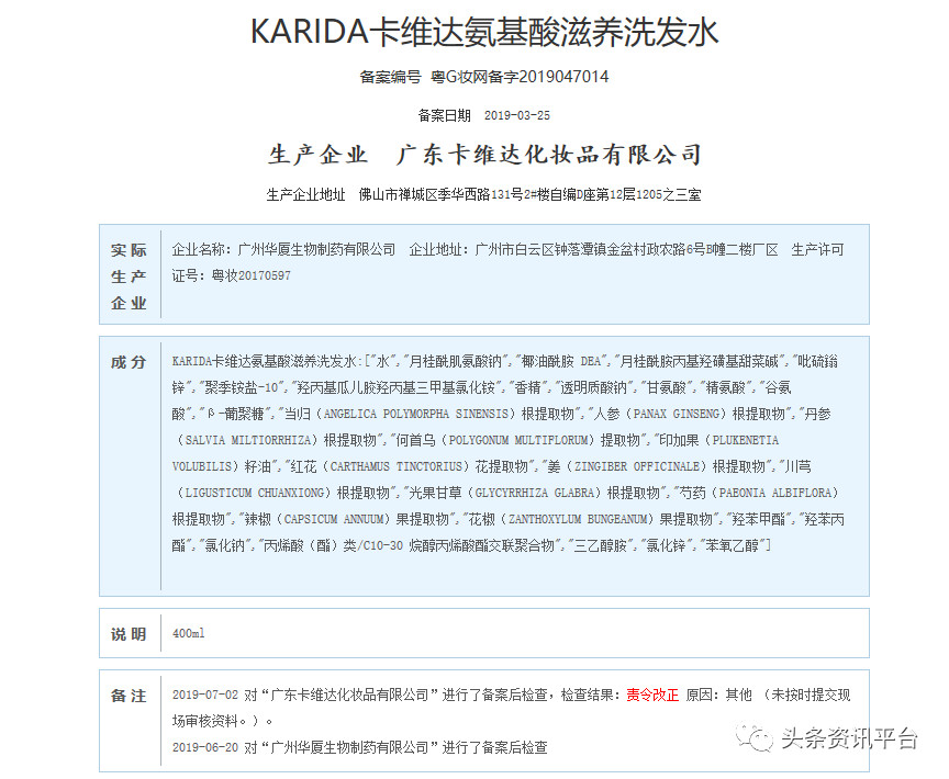 下面,我们再来看看卡维达的产品有没有问题。经查国产非特殊用途化妆品备案平台,我们发现“KARIDA卡维达氨基酸滋养洗发水”、“KARIDA卡维达多重功效眼霜”、“KARIDA卡维达梦幻睫毛膏01黑色”、“KARIDA卡维达明星唇釉501”、“KARIDA卡维达明星唇釉503”、“KARIDA卡维达滋养润唇膏”、“卡维达柔润保湿护手霜”、“KARIDA卡维达懒人洁面泡泡”、“KARIDA卡维达亲肤贝贝多重功效宝宝霜”、“KARIDA卡维达金箔赋活精华液”、“卡维达温变润唇口红”等多款产品都曾被要求责令改正,原因皆为未按时提交现场审核资料。