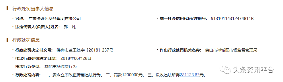 2018年6月28日,卡维达公司因“其他市场违法行为”遭到了佛山市禅城区市场监督管理局的处罚,处罚内容为: