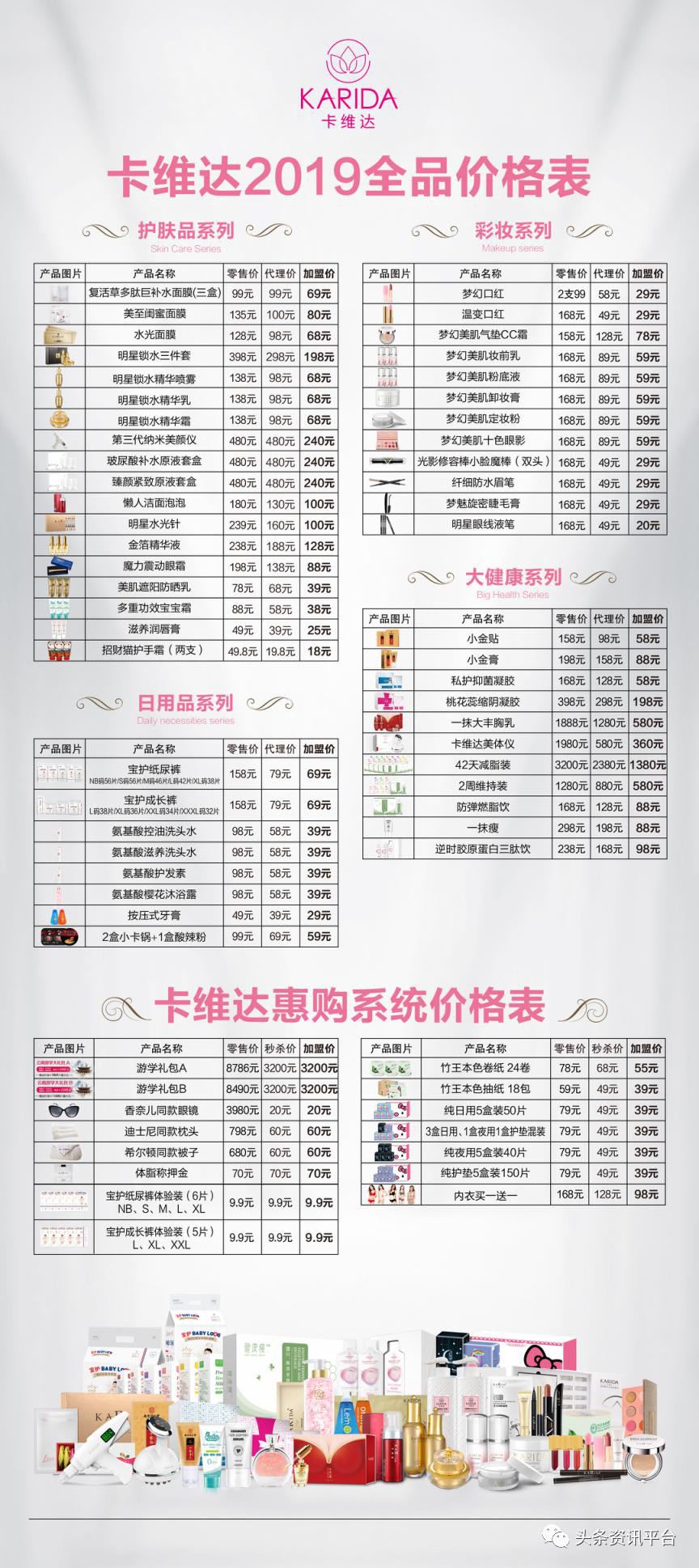 卡维达名下产品种类繁多,有几十种各线产品,且多与女性有关,比如美胸仪、小金膏、一抹瘦、丰胸产品、彩妆系列、私处护理、卫生巾、补水面膜、水光枪、日用品等等,难怪会被人称为“万能微商”。