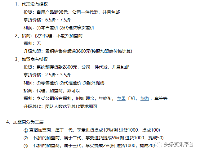 通过对比,我们发现其加盟制度原来的版本是一代10%的奖金,即280元、二代5%的奖金,即140元、三代2%的奖金,即56元,且直属50人以上,享受总代额外提成1%-2%。总得来看,除了直推奖增加了三倍之外,差别并不大。