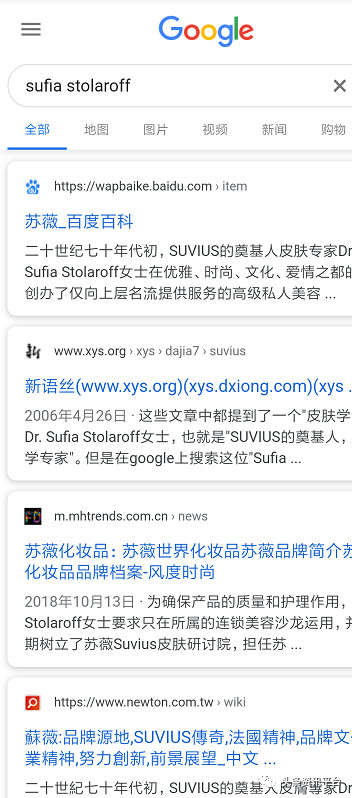 再来说说“SUVIUS的奠基人、皮肤学专家”Dr. Sufia Stolaroff女士,多年前,就有有心人通过google搜索了这位“Sufia Stolaroff”,当时并没有一个英文或者法文网页弹出,搜出来的全都是中文网页,并且全都是不同网站转载的同一篇文章。如今,我们再次对其进行搜索时,同样发现带有该关键词的网页,果然大部分也都是中文。
