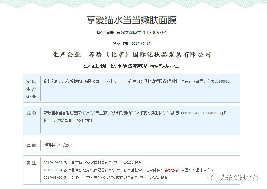 经查国产非特殊用途化妆品备案平台,我们发现“享爱猫水当当嫩肤面膜”曾被责令改正,原因为“产品未生产”。无独有偶,出现相同状况的产品还包括“享爱猫水当当嫩肤套装---享爱猫水当当能量素精华液”。