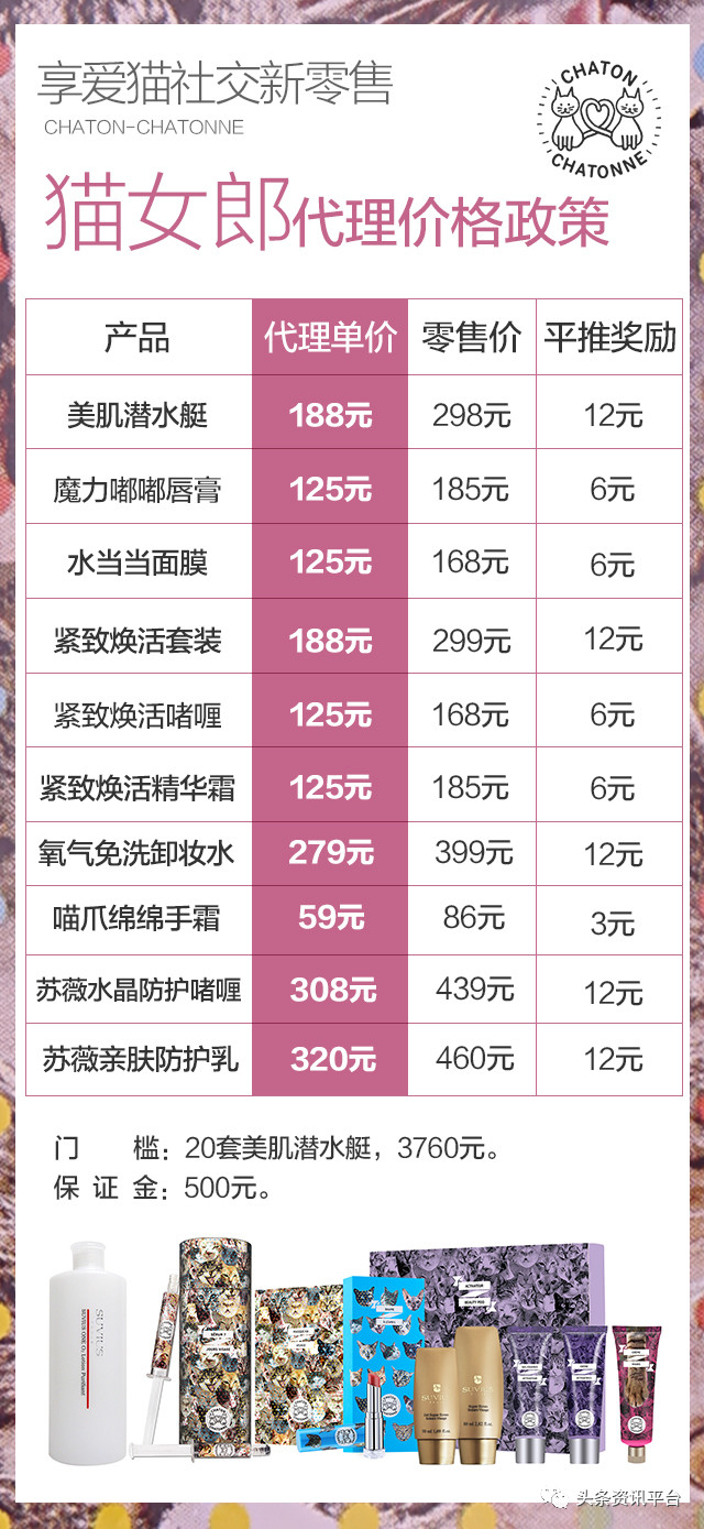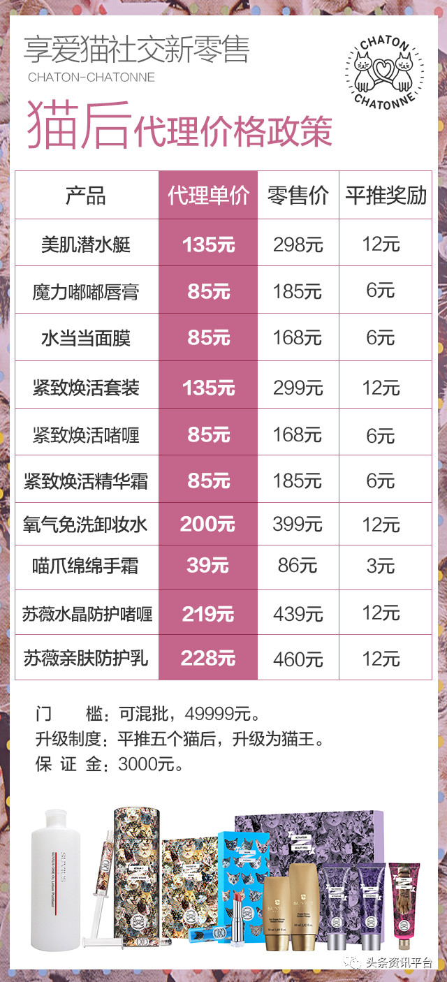 据小李介绍,猫后的加盟门槛是49500元(另有图片显示,目前似乎只需29800元),猫爵门槛为16800元(平推三个猫爵,可升级为猫后,保证金1000元),猫女郎是3760元(20套美肌潜水艇,保证金500元),小猫猫是660元(3套美肌潜水艇)。