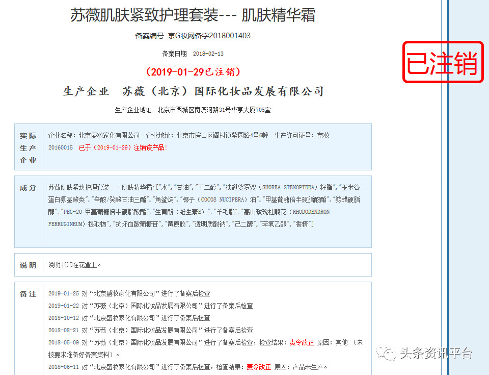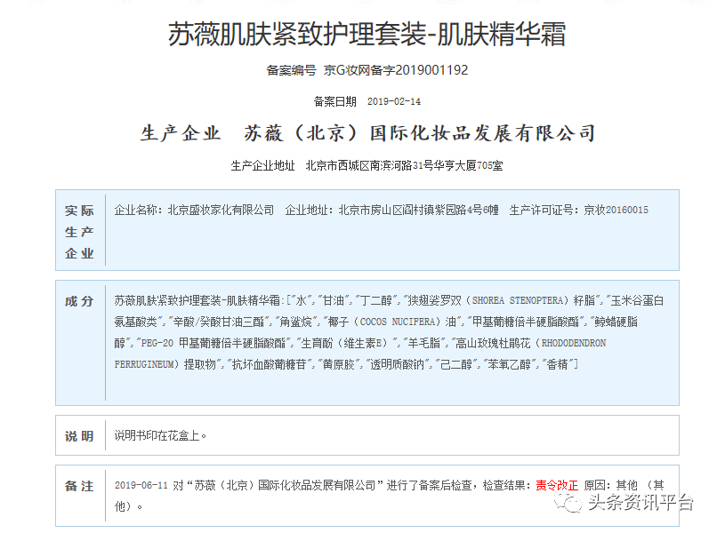 享爱猫的产品看完了,再来看看苏薇品牌的产品。经查,“苏薇肌肤紧致护理套装-肌肤精华霜”在2019年6月被责令改正。(备案编号为京G妆网备字2019001192 )