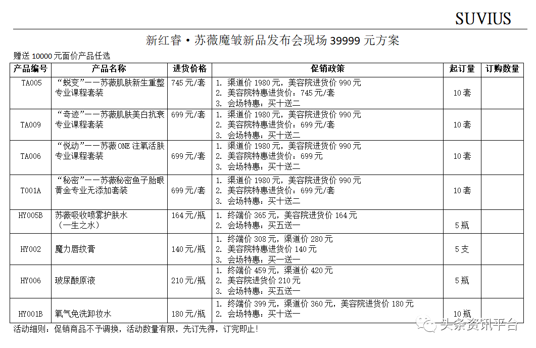 先说苏薇,主要针对美容店供货的苏薇产品的加盟门槛是3.99万元,剩下的级别还有6.9万元和19.9万元。据推广人员小李介绍,“投资39900,额外还能赠送你1万块钱的产品,其他权益还包括能够在一些产品上享受特价,部分顾客还能享受买十送二等等。”加入苏薇后,参与者也有推荐奖可拿,直推一个人加入,自己就可以拿到价值百分之十的返货。