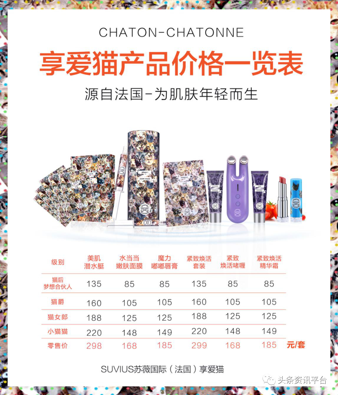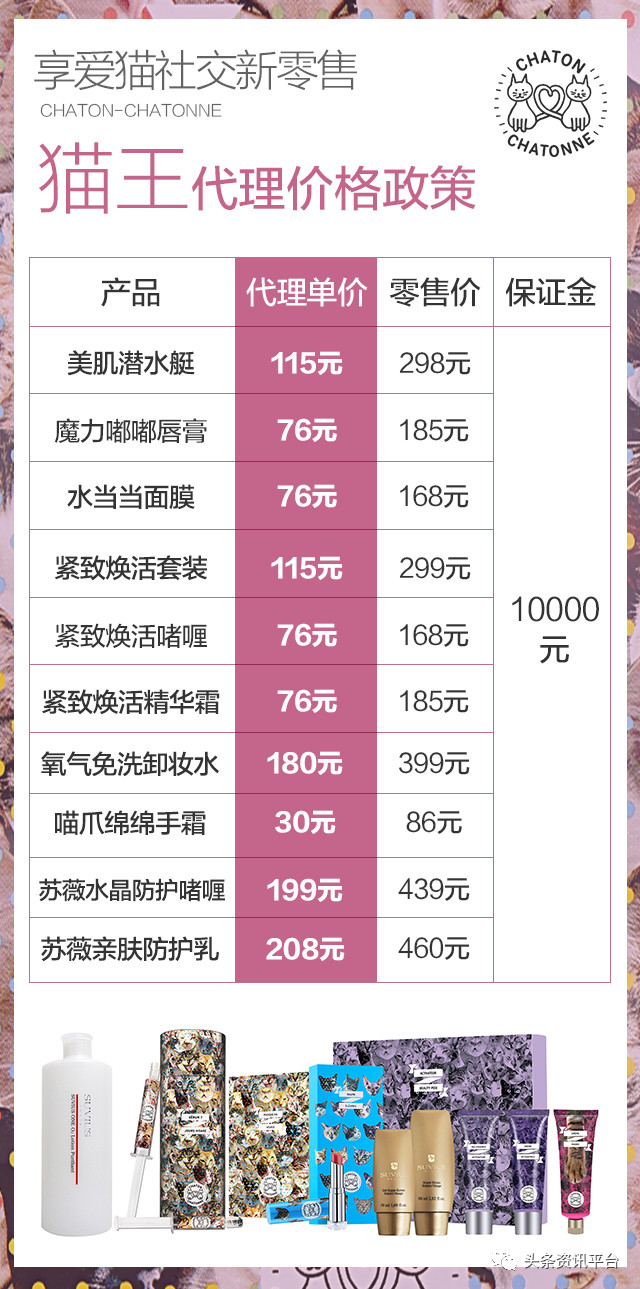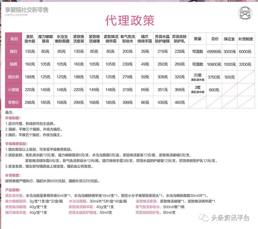 享爱猫的代理级别基本上可以分为四个等级(实际上是五级),分别是猫后、猫爵、猫女郎和小猫猫,不同代理级别的拿货价不同,我们以零售价为185元的魔力嘟嘟唇膏为例,小猫猫的拿货价为149元,猫女郎的拿货价是125元,猫爵的拿货价是105元,猫后的拿货价是85元。